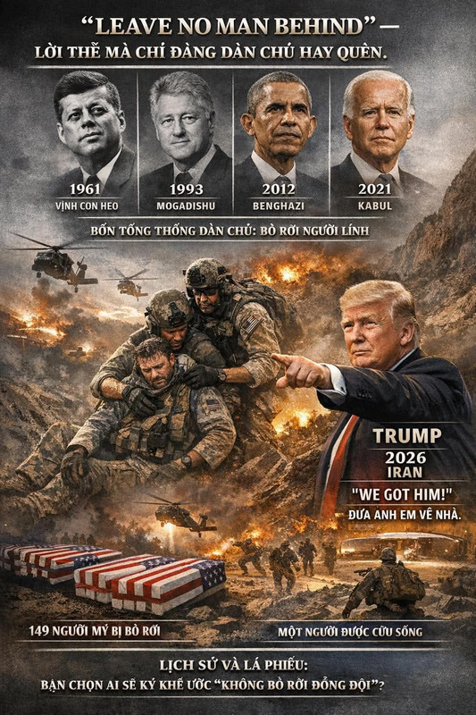 Trong kho tàng nguyên tắc quân sự của Hoa Kỳ, không có nguyên tắc nào thiêng liêng hơn năm chữ: “Leave no man behind” — không bỏ lại ai phía sau. Ðó không phải khẩu hiệu tuyển quân. Ðó là khế ước máu giữa quốc gia và người lính: rằng nếu anh sẵn sàng chết cho đất nước, thì đất nước sẽ không bỏ rơi anh khi anh cần đất nước nhất. Và khi người ngồi trong Phòng Bầu Dục phản bội lời thề ấy, không chỉ người lính chết — chính danh dự của nền cộng hòa chết theo.