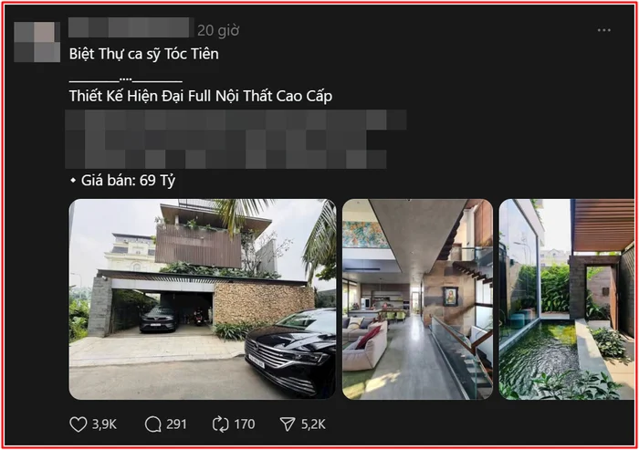 Theo như sự xôn xao biệt thự của nữ ca sĩ hàng đầu showbiz được rao bán gần 70 tỷ đồng trong bài đăng mới đâ đã rao bán biệt thự của nữ ca sĩ này khiến dân tình không khỏi xôn xao. Ngôi nhà được cho là một trong những căn biệt thự có thiết kế hiện đại và độc đáo bậc nhất giới nghệ sĩ Việt, gắn liền với hình ảnh cặp đôi nổi tiếng này trong nhiều năm qua.